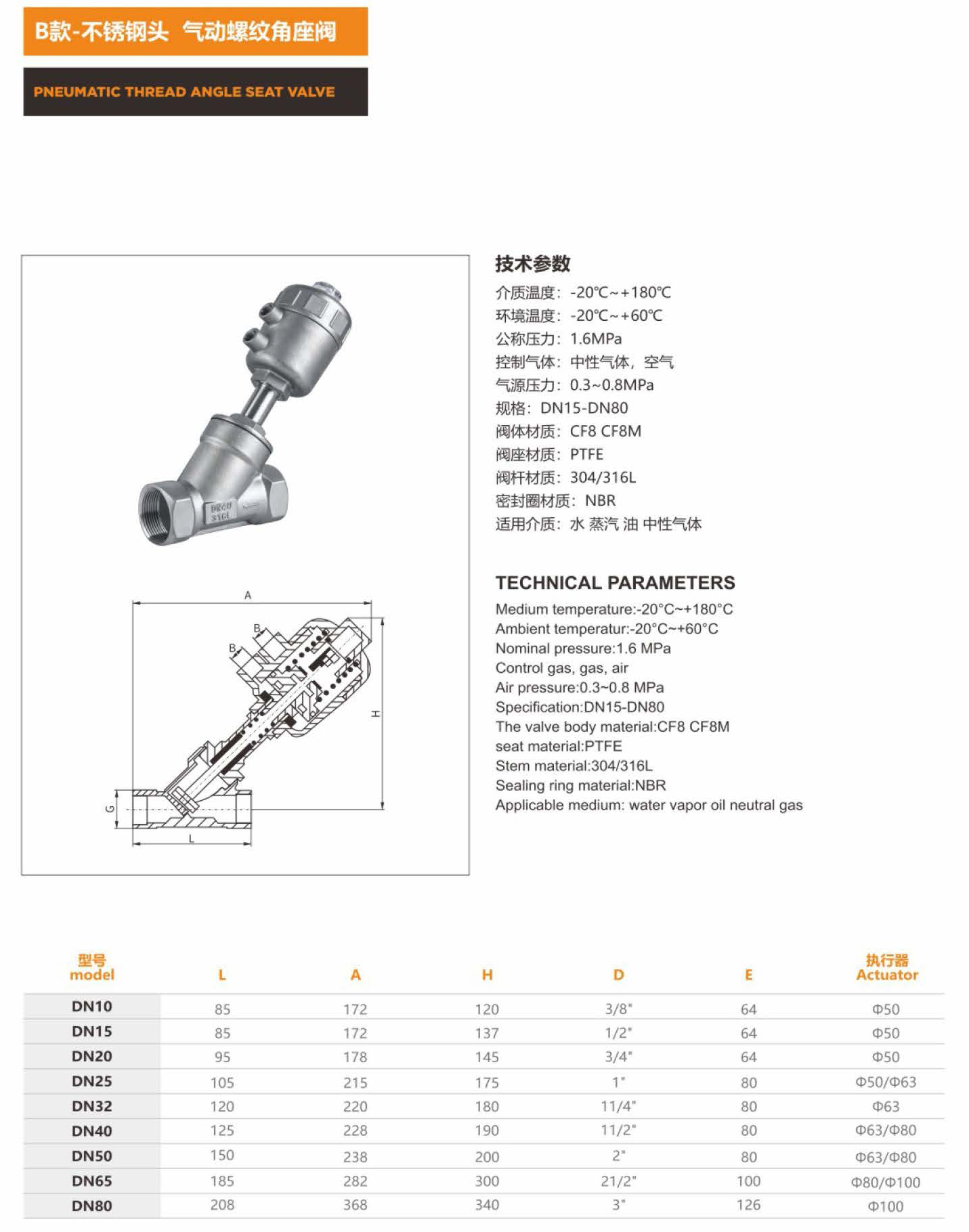 B款 不锈钢头 气动螺纹角座阀